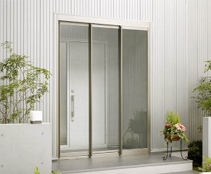 機能的でスタイリッシュな新型風除室!ツインガードⅢ I型 1. 玄関ドアの開閉による風の吹き込みを防ぎます! 2. 自転車やベビーカーなどを置くスペースとしても便利! 3. 袖付2枚引は開口が広くて出入りがしやすい!