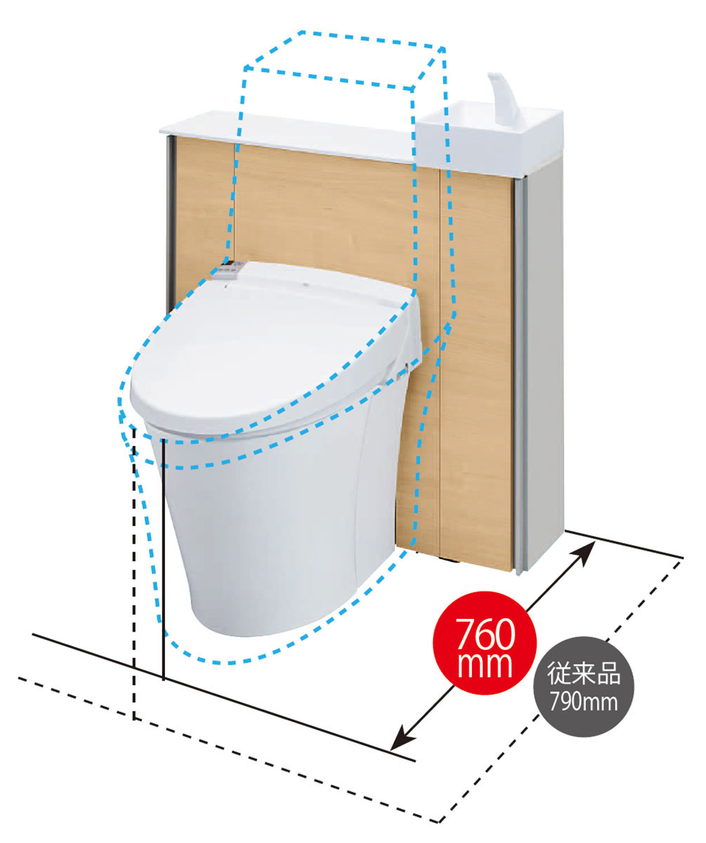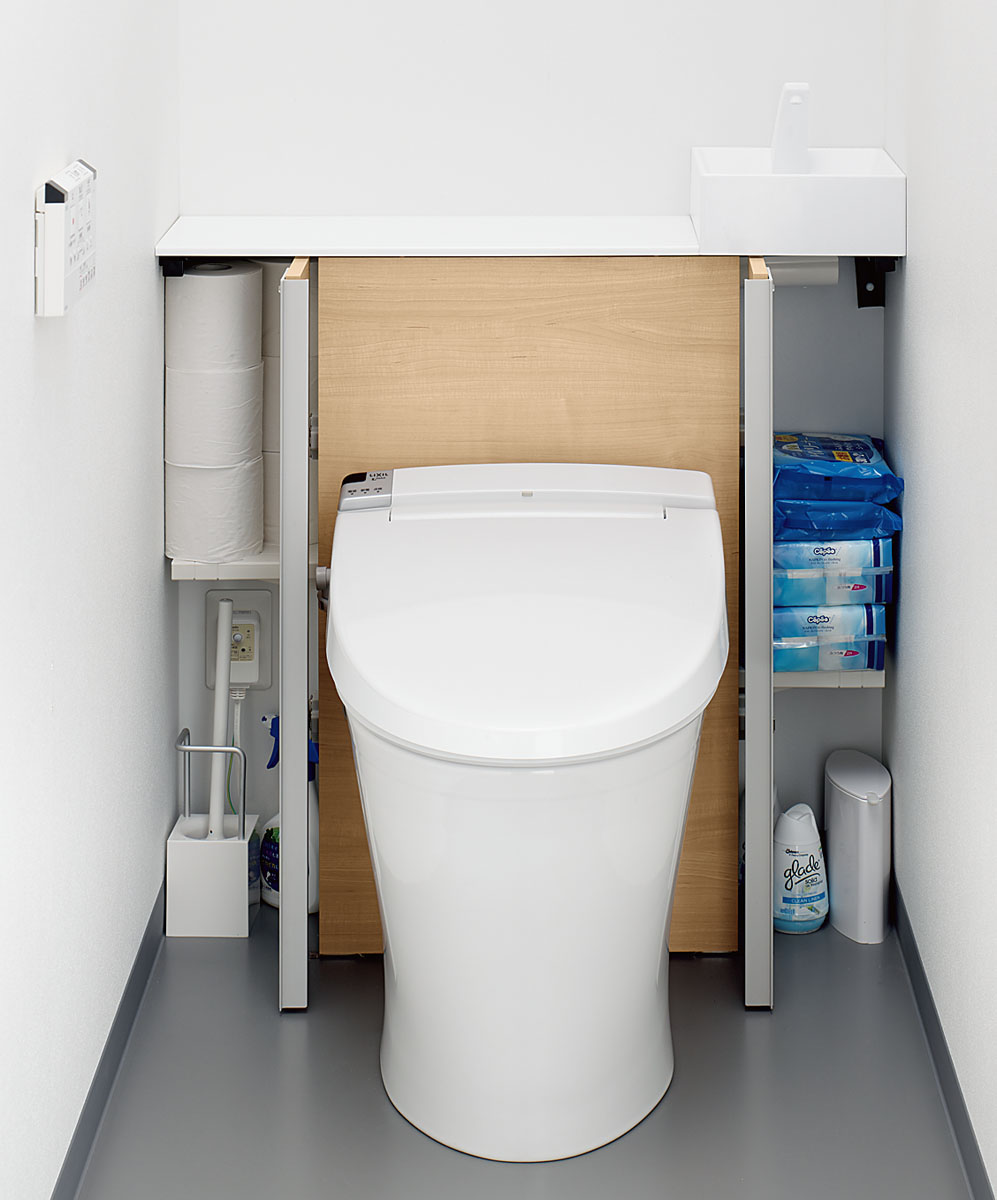 キャビネットの中にタンクを収納。 水抜き栓やコンセント、給水ホースも隠せて、見た目スッキリ! トイレットペーパーや掃除道具も収納できます。 お掃除しにくいタンクまわりをキャビネットで隠したのでトイレまわりを拭くだけでラクにお手入れ。 すっきりとしたデザインなので、コンパクトな空間にもぴったりなサイズです。 1日でリフォーム完成!タンクレスのようなすっきりデザインに生まれ変わります。