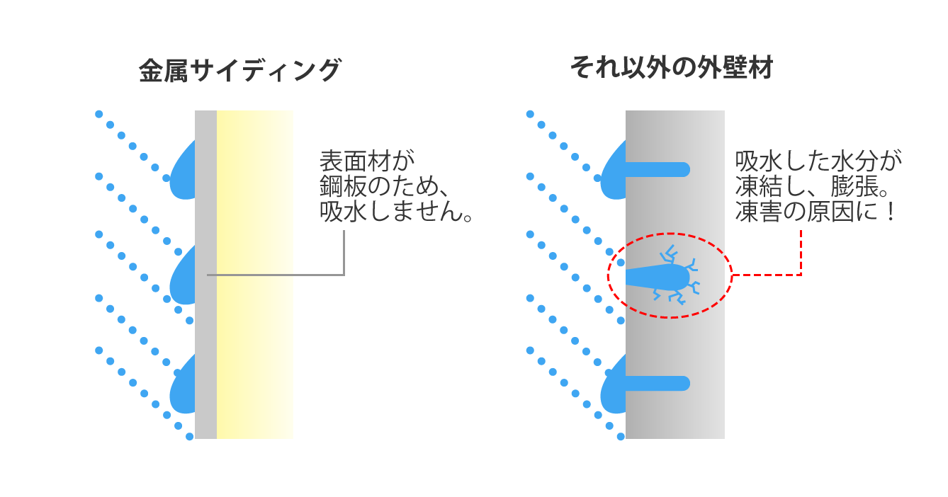表面材が鋼板なので、給水することがなく、寒冷地で起こりがちな凍害の心配がありません。