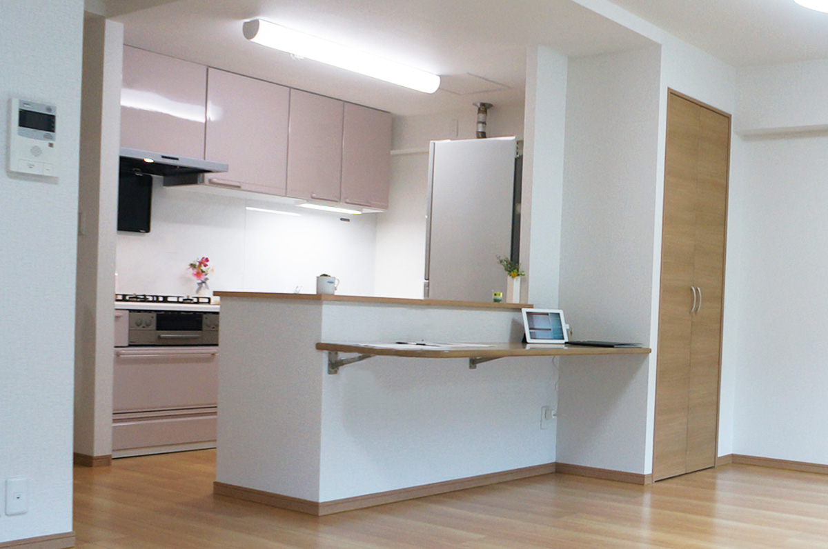 壁があって、暗く熱がこもりがちなキッチンはリビング側の壁をなくしました。