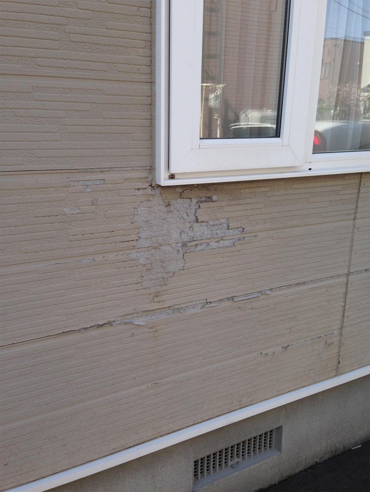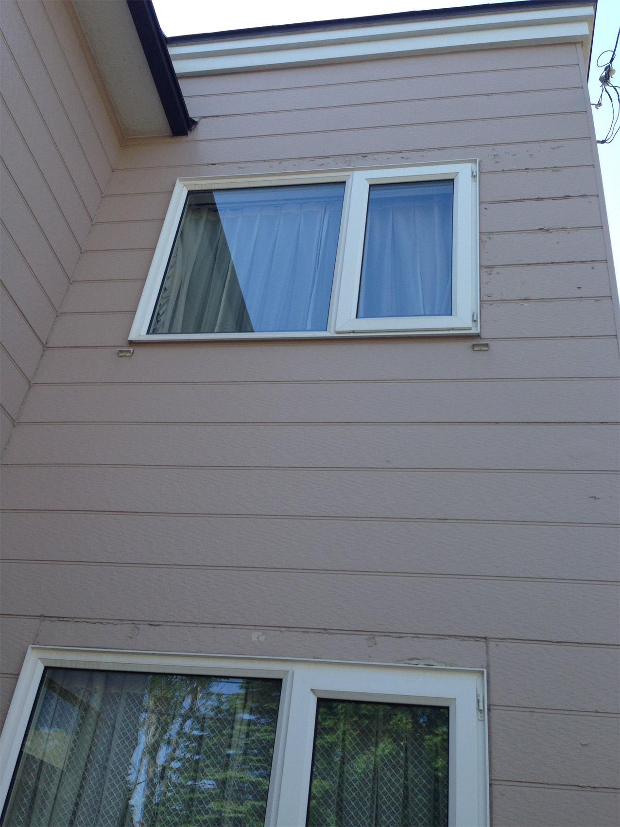窓下を中心に外壁が剥がれて、防水が切れています。