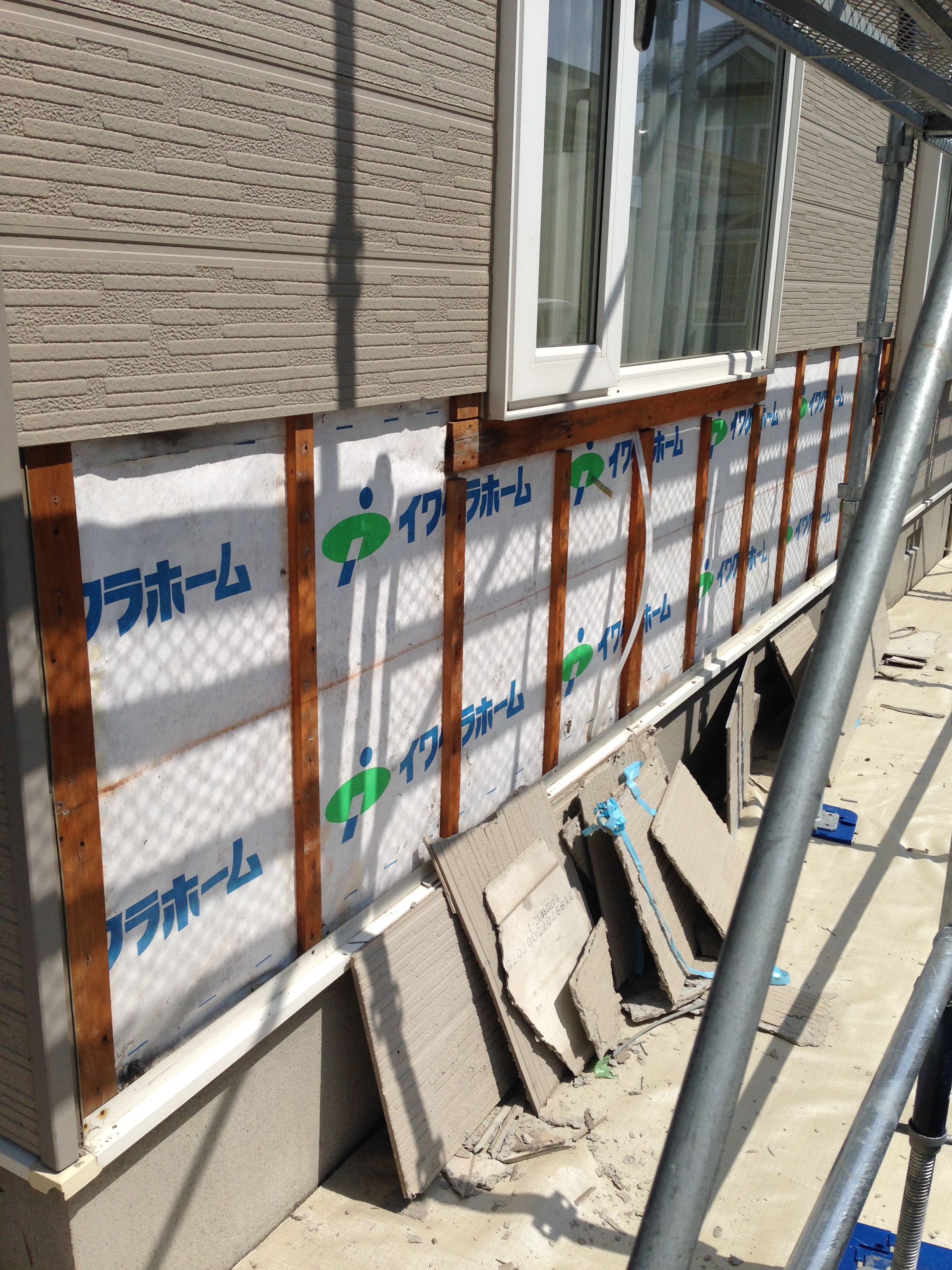 樹脂製サイディングの場合、一度既存の建物の廻りを全て防水紙でこのように貼り上げます。