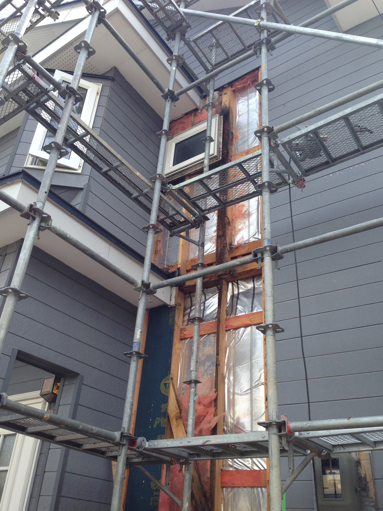 傷んでいたサイディング、中の防水紙、グラスウール、柱を全て新しく入替えます。