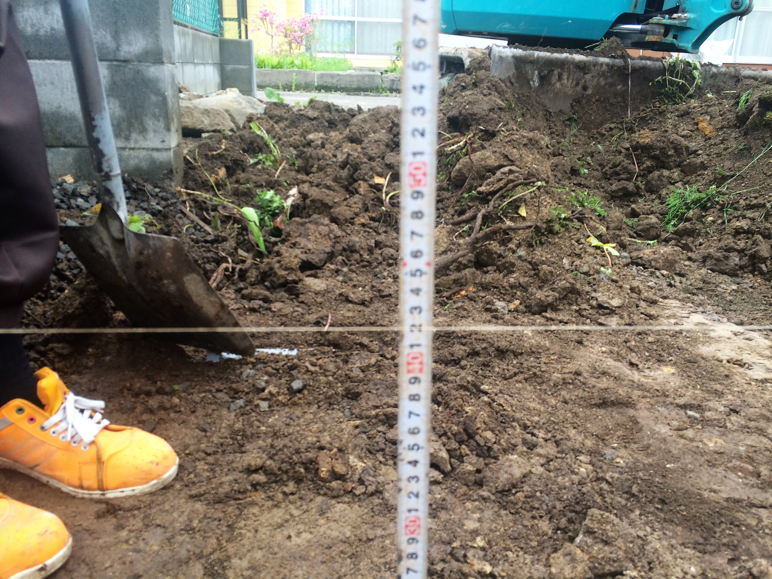 こちらは、アスファルト舗装の路盤工事の際に、深さをしっかり掘れているかを図った時の写真です。