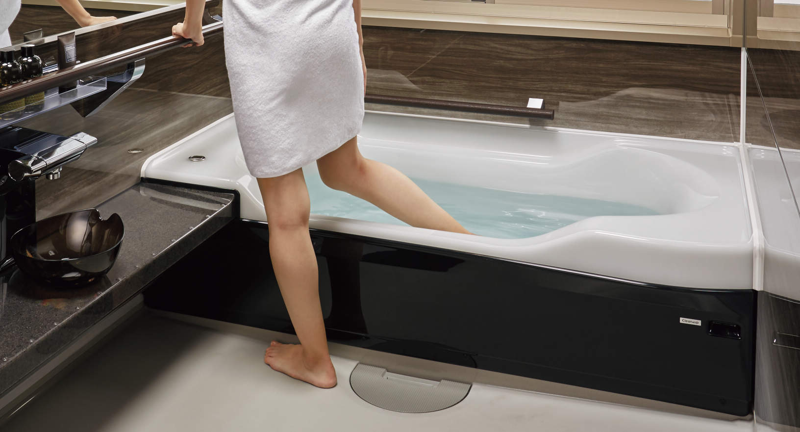 ラクな動作で浴槽に入れる安心設計の浴槽。