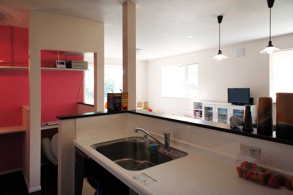 お家のポイントとなる、ピンクの多目的カウンターは奥様のプライベートスペースとして大活躍。